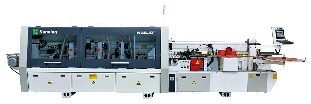 Кромкооблицовочный станок NB6JF / NB6JQF предназначен для облицовывания прямолинейных кромок плитных материалов рулонными кромками АБС, ПВХ и полосовым кромочным материалом толщиной до 3 мм.